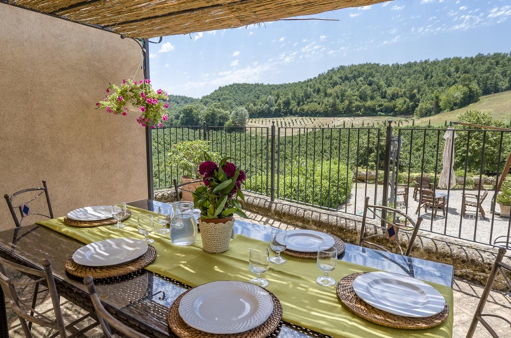Drei-Zimmer Ferienwohnung: Die rustikalsten unter den Wohnungen, mit antiken Holzbalken und Wänden, die die Basis des Turms bilden. Es befindet sich im Erdgeschoss vor dem Pool. Es besteht aus einem großen Wohnzimmer mit TV, Einbauküche und Doppelschlafcouch, ein Schlafzimmer mit Doppelbett, ein Schlafzimmer mit zwei Einzelbetten, ein komfortables Badezimmer mit Dusche. Tisch im Freien. 4+2 Pers.