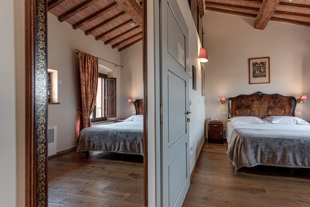 Die Zimmer des Palazzo Pacini verbinden historischen Charme mit modernem Komfort. Jedes Zimmer ist individuell gestaltet und bewahrt die Atmosphäre eines toskanischen Adelspalastes. Hohe Decken, antike Möbel und elegante Stoffe schaffen ein Gefühl von zeitloser Eleganz. Viele Räume verfügen über originale Fresken oder freiliegende Steinwände, die an die Geschichte des Hauses erinnern. Die Betten sind besonders komfortabel, mit hochwertigen Matratzen und edler Bettwäsche ausgestattet. Die Badezimmer sind modern renoviert und bieten Dusche oder Badewanne, Pflegeprodukte und Haartrockner. Einige Zimmer haben auch einen wunderschönen Blick auf die Altstadt oder auf die toskanischen Hügel. Klimaanlage, WLAN und Flachbildfernseher gehören überall zur Ausstattung. Die Kombination aus Tradition und Komfort macht den Aufenthalt einzigartig. Besonders beliebt sind die Romantik-Zimmer mit dekorativen Details und warmem Licht. Die Einrichtung spiegelt den Stil des 18. Jahrhunderts wider, ohne auf modernen Luxus zu verzichten. Jedes Detail – von den Vorhängen bis zu den Lampen – wurde mit viel Liebe ausgewählt. Am Morgen erwartet die Gäste ein reichhaltiges Frühstück in historischem Ambiente. Die Zimmer des Palazzo Pacini sind ideal für Gäste, die Kultur, Ruhe und toskanische Eleganz suchen. Hier wohnt man nicht einfach – man erlebt ein Stück Geschichte.