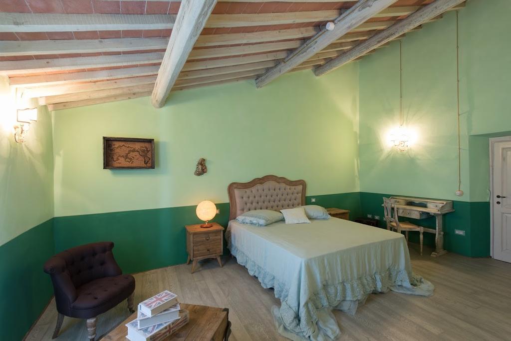 Doppelzimmer: Royal Suite. Der Name verkündet die Pracht dieser Suite. Das La Magnifica befindet sich außerhalb des Hauptbauernhauses in einer unabhängigen Villa und bietet einen Blick auf einen privaten Garten, von dem der Blick über die toskanische Landschaft eine intimere und exklusive Atmosphäre bekommt. Ein kleines Paradies, in dem Sie sich in der Sonne entspannen, ein Glas Wein trinken und ungestörte Farben und die Atmosphäre unseres Landes genießen können. Durch ein großes französisches Fenster betreten Sie ein warmes und einladendes Universum, in dem die Hinterlassenschaften vergangener Pracht zusammen mit den Merkmalen der zeitgenössischen Wesentlichkeit leben. Typische Elemente der ländlichen Umgebung, wie freiliegende Holzbalken und Möbel mit schäbigem Minimalismus, rahmen den Hauch des späten Rokoko-Stils ein, während die handwerklichen Majolika-Kacheln sich gegenseitig verfolgen, bis die doppelte Dusche, die sich hinter dem Bett versteckt, sich offenbart all seinen Charme. Die Bettwäsche und Handtücher sind aus reiner Baumwolle: Weiße Laken und weiche Schwämme, die gemäß der Philosophie unseres Anwesens mit Liebe und Respekt für die Natur behandelt werden, umhüllen Sie mit einem Duft, der aus leichten und eleganten Noten besteht.