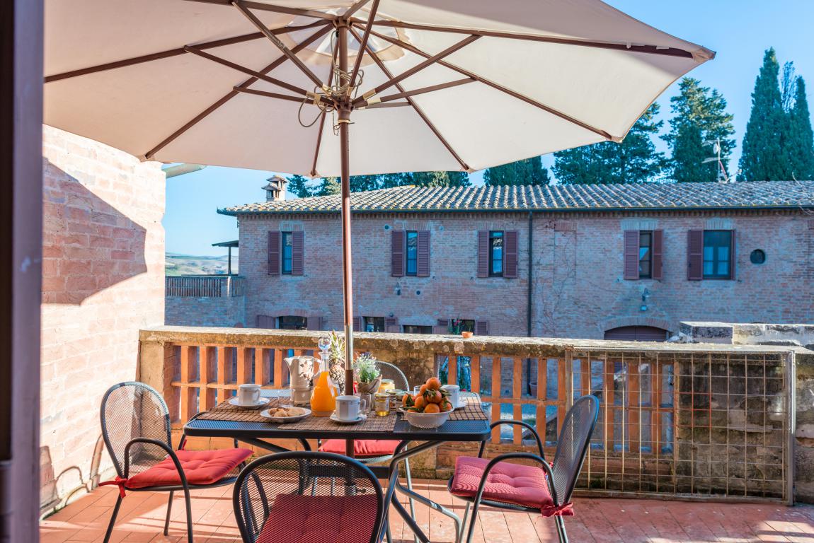 Drei-Zimmer Ferienwohnung: Die Wohnungen der Chiocciola-Wohnung waren in der Antike die Wohnräume, in denen der Dorfaufseher lebte. Heute ist die Wohnung in zwei Etagen aufgeteilt, um ein elegantes Erddach zu bilden. Das Erdgeschoss ist der Bereich der Entspannung gewidmet und besteht aus einem großen Wohnbereich mit Kamin und offener Küche. Im Erdgeschoss befinden sich auch zwei Schlafzimmer mit Doppelbett und zwei Badezimmer mit Dusche. Wenn Sie die Stufen der Wendeltreppe hinaufsteigen, gelangen Sie in den ersten Stock, wo ein gemütlicher Dachboden geschaffen wurde, der als Arbeitszimmer und Spielbereich genutzt werden kann. Der Außenbereich des Chiocciola Apartments ist einer der schönsten des gesamten Anwesens. Die große private Terrasse aus Terrakotta, Ziegeln und Sand eignet sich perfekt für leckere Aperitifs oder romantische Abendessen. Das Chiocciola Apartment ist mit einer Klimaanlage ausgestattet. Max 4 Pers.