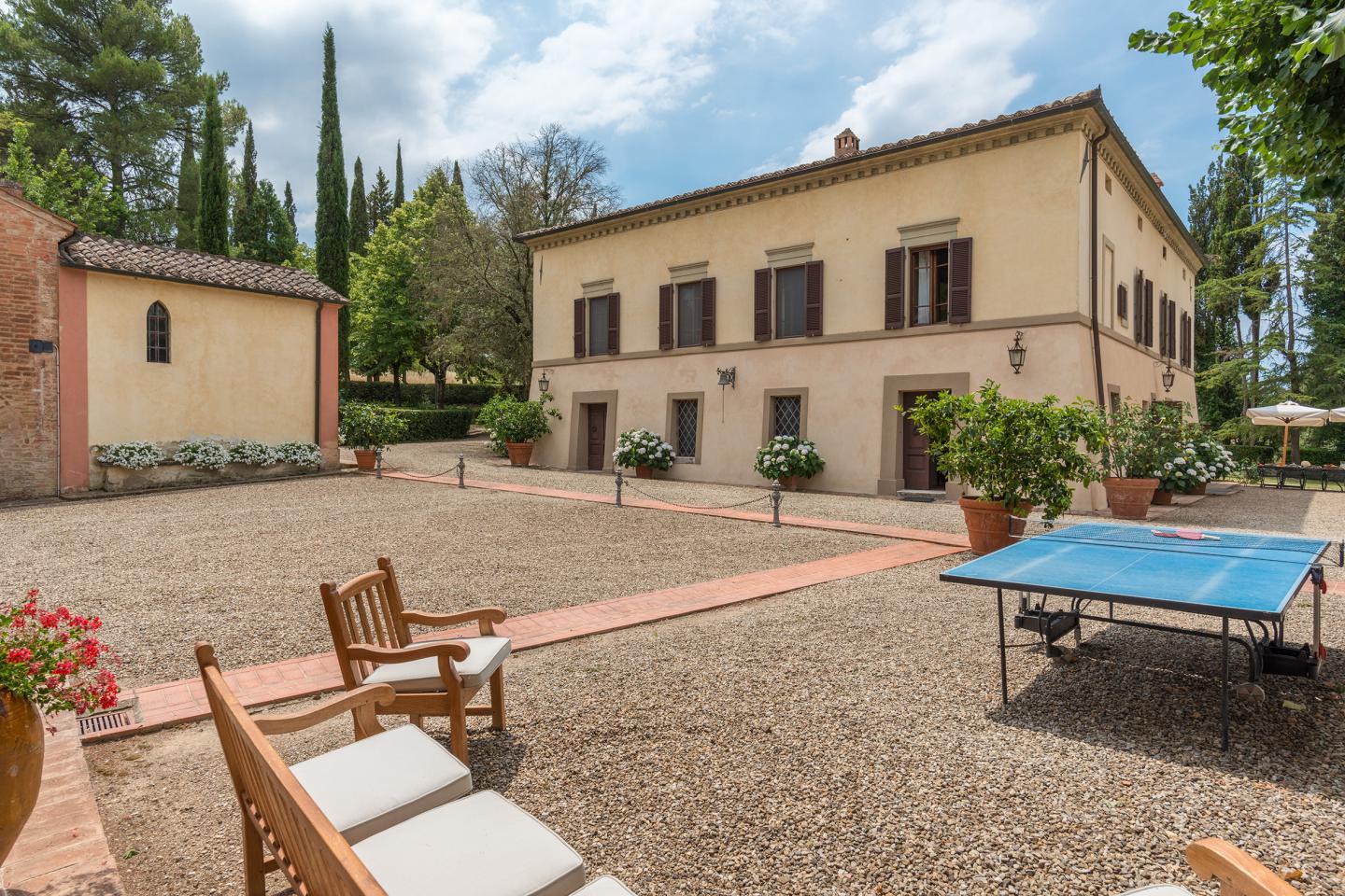Ferienhaus: Die "Villa" ist der zentrale Teil des La Campana-Anwesens. Innen fein dekoriert, zeichnet die Struktur die geometrischen Linien der typischen toskanischen Architektur nach. Das Erdgeschoss besteht aus dem Eingang, dem großen Wohnzimmer mit Kamin, der privaten Lounge, dem geräumigen Esszimmer, dem Spielzimmer und dem TV-Raum sowie der großen Küche mit Kamin, einem Raum, der als Lagerhaus genutzt wird, und dem charmanten Keller . Im ersten Stock befinden sich neben dem eleganten Billardzimmer drei Doppelzimmer, zwei Zweibettzimmer und ein Einzelzimmer, alle mit eigenem Bad. Der Umfang der Villa wird durch einen großen Garten begrenzt, in dem Sie auch den Swimmingpool für die ausschließliche Nutzung der Villa erreichen und sich entspannen können, indem Sie sich in der Schönheit der Landschaft verlieren. Max 11 Pers.